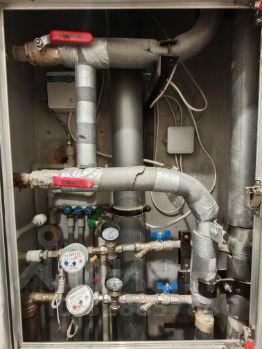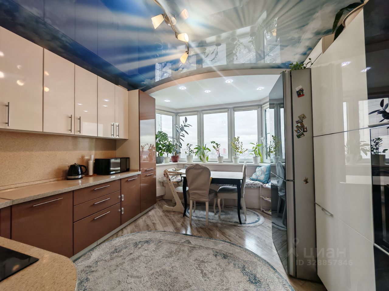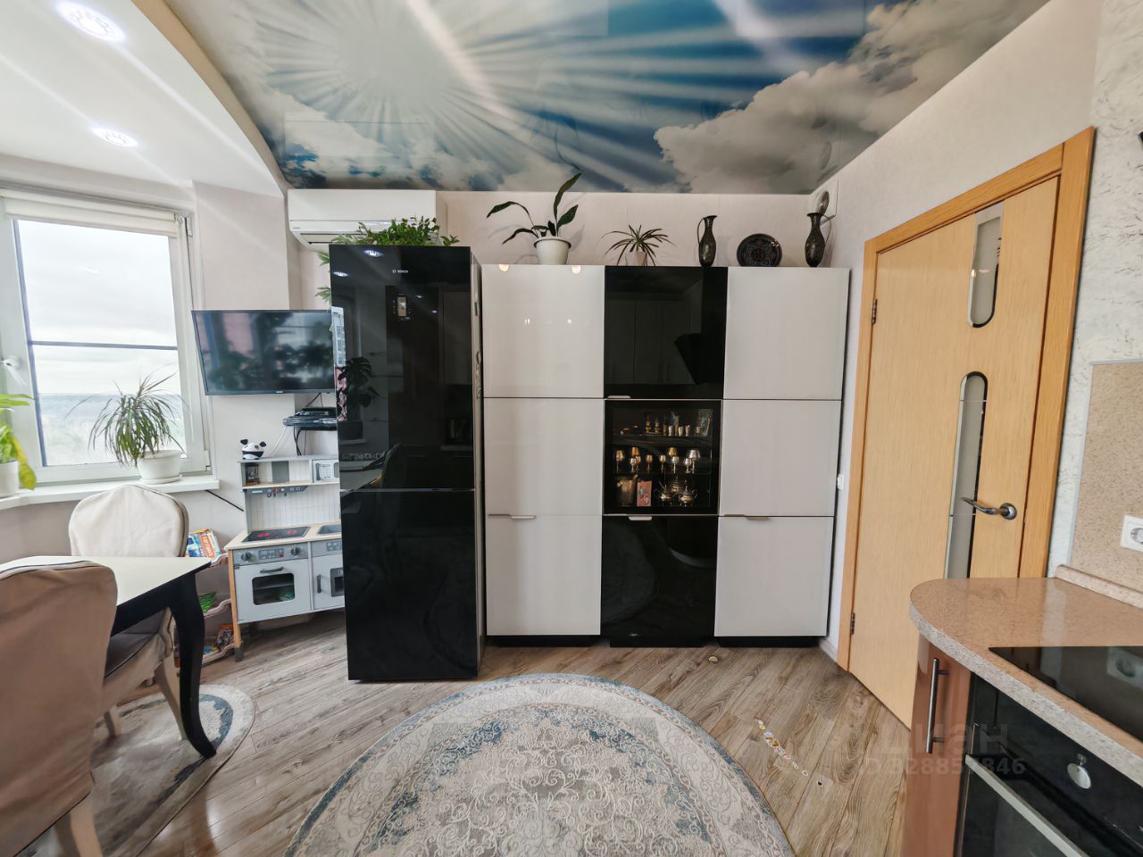 ---В квартире дорогой современный ремонт. Высококачественное сантехническое и электрооборудование. Натяжной потолок, ламинат высокого класса. Кондиционеры на кухне и в большой комнате; в двух других комнатах заложена трасса под кондиционер (осталось установить внутренний и внешний блоки). Проточный водонагреватель на случай отключения горячей воды летом. В совмещенном санузле установлен трап для удаления воды в случае залива. Вся встроенная мебель и техника остаётся в подарок покупателю.
