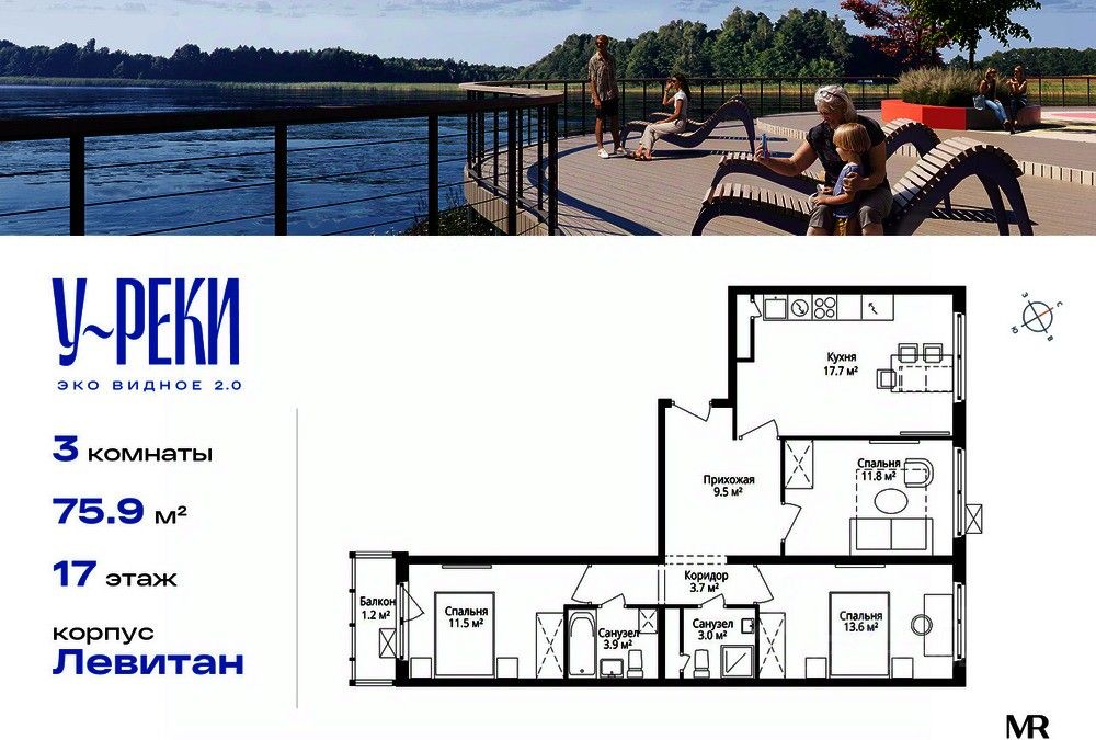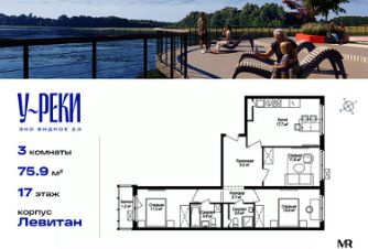 Продаётся 3-комнатная квартира общей площадью 75.90 м² с чистовой отделкой в ЖК "У реки. Эко Видное 2.0" на 17-м этаже 17 этажного корпуса Левитан.