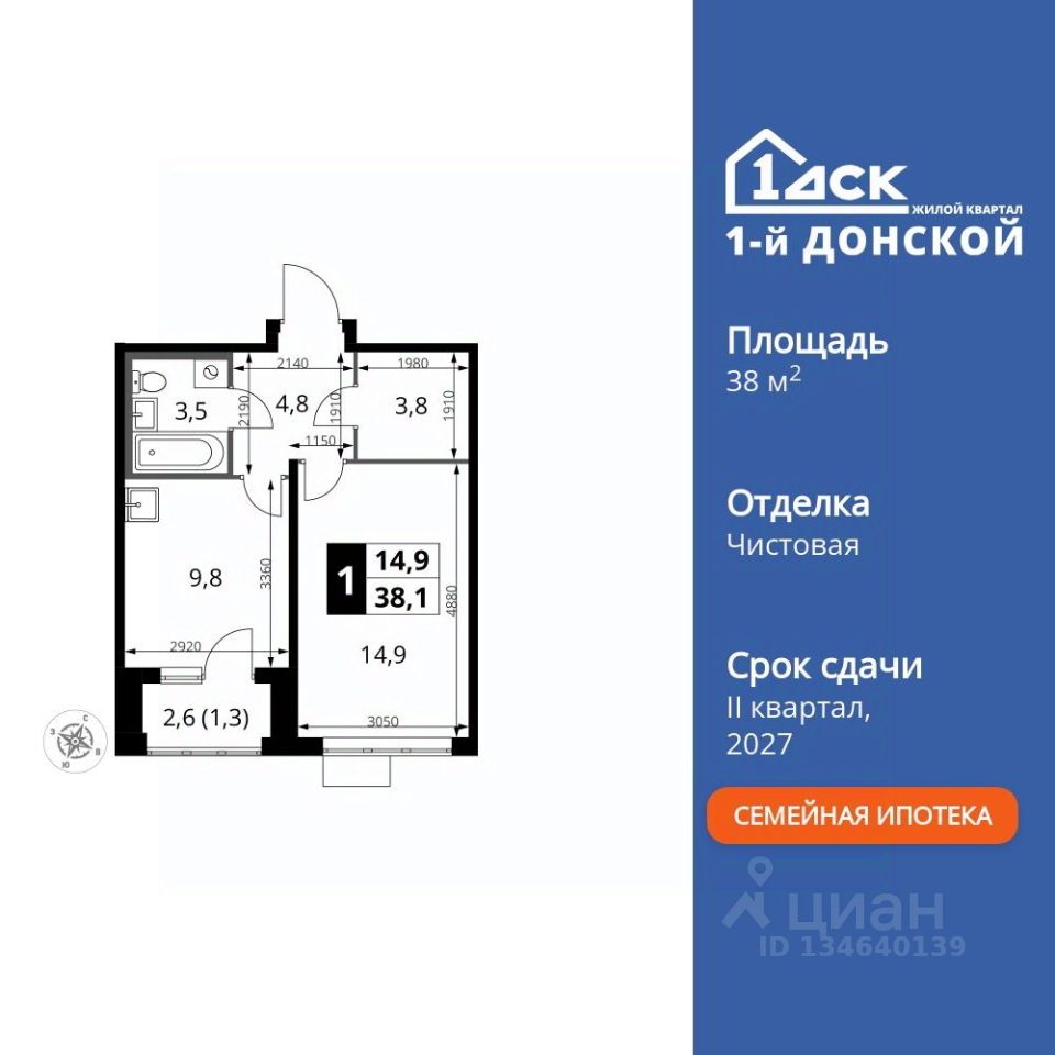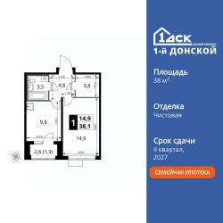 Продаётся 1-к квартира номер 363 общей площадью 38.1 кв.м. на 12-м этаже 24 этажного здания.