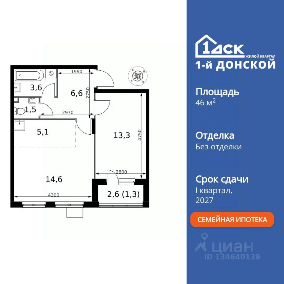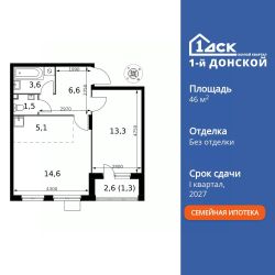 Продаётся 2-к квартира номер 729 общей площадью 46 кв.м. на 20-м этаже 24 этажного здания.