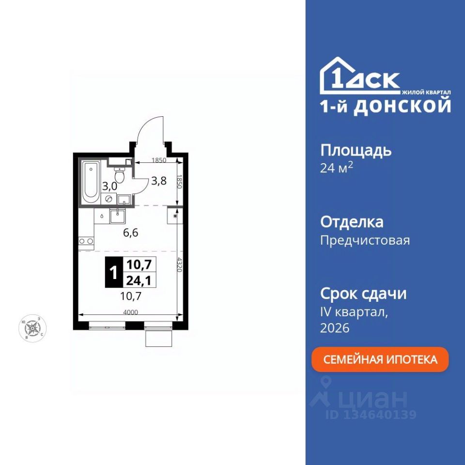 Продаётся квартира-студия номер 577 общей площадью 24.1 кв.м. на 12-м этаже 24 этажного здания. Предчистовая отделка. Цена с учётом скидки.