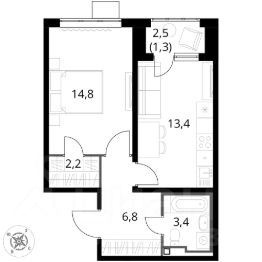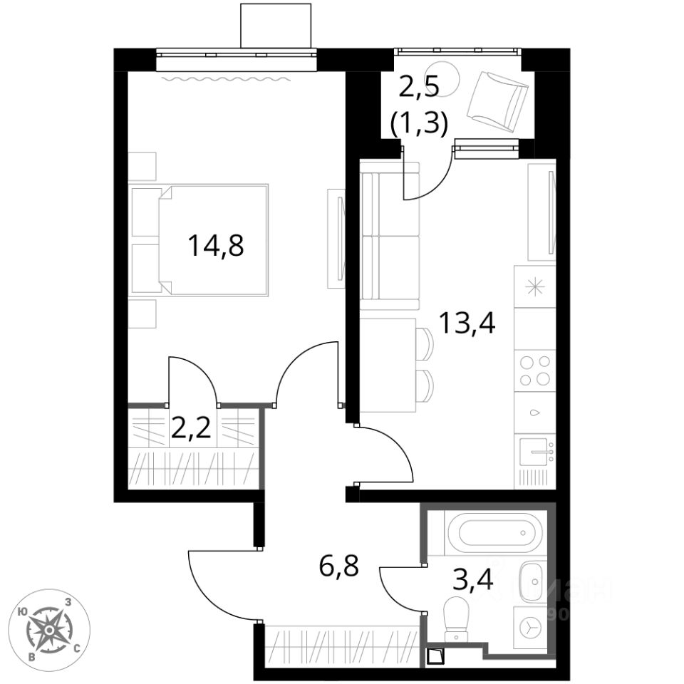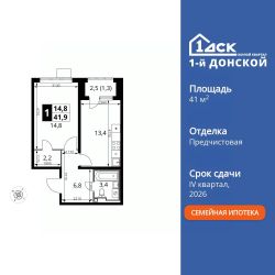 Продаётся 1-к квартира номер 908 общей площадью 41.9 кв.м. на 23-м этаже 24 этажного здания.