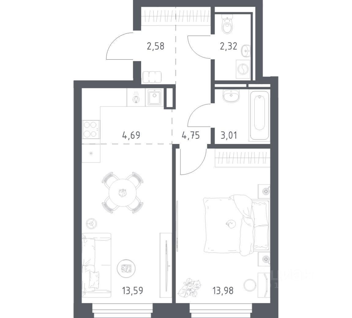Строим кварталы для жизни с заботой о будущем. Предлагается 1-комнатная квартира комфорт-класса площадью 44,4 кв.м в корпусе 13.1 на 13-м этаже, в жилом комплексе "Новое Видное".