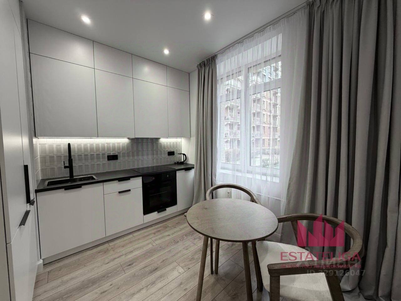 Выполнен современный дизайнерский ремонт в светлой нейтральной гамме с продуманной эргономикой пространства. Кухня полностью укомплектована встроенной техникой, включая встроенный холодильник, организована удобная обеденная зона со столом и стульями из натурального дерева. Просторная кухня-гостиная выглядит светло и аккуратно благодаря большим окнам и продуманному освещению.