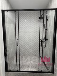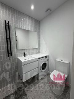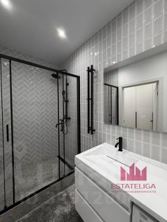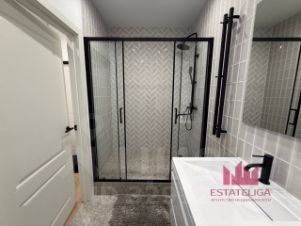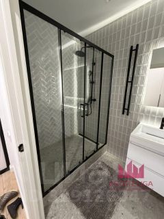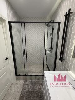 Санузел выполнен в современном стиле: душевая зона с стеклянным ограждением, качественная сантехника, стиральная машина уже установлена -всё новое и готово к использованию.