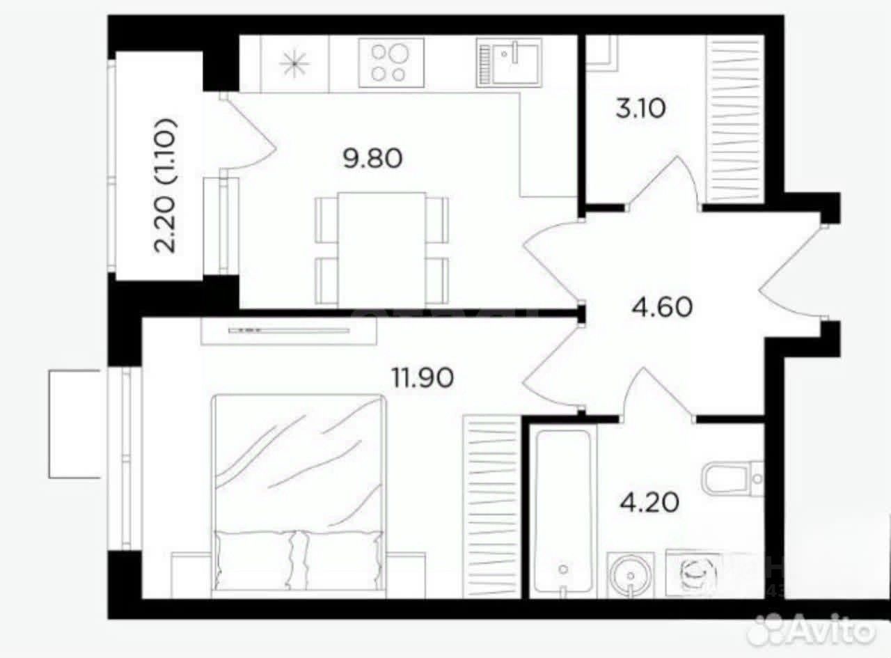 • Площадь: 34,7 м² (кухня — 9,8 м²).