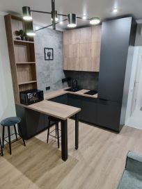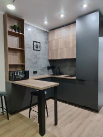 -Кухонный гарнитур - ателье мебели "Mister Dors" со встроенным холодильником, Очень вместительные шкафы ,стол-барная стойка, два полубарных стула, вытяжка, эл. плита ,встроенный холодильник с морозильной камерой, микроволновка.