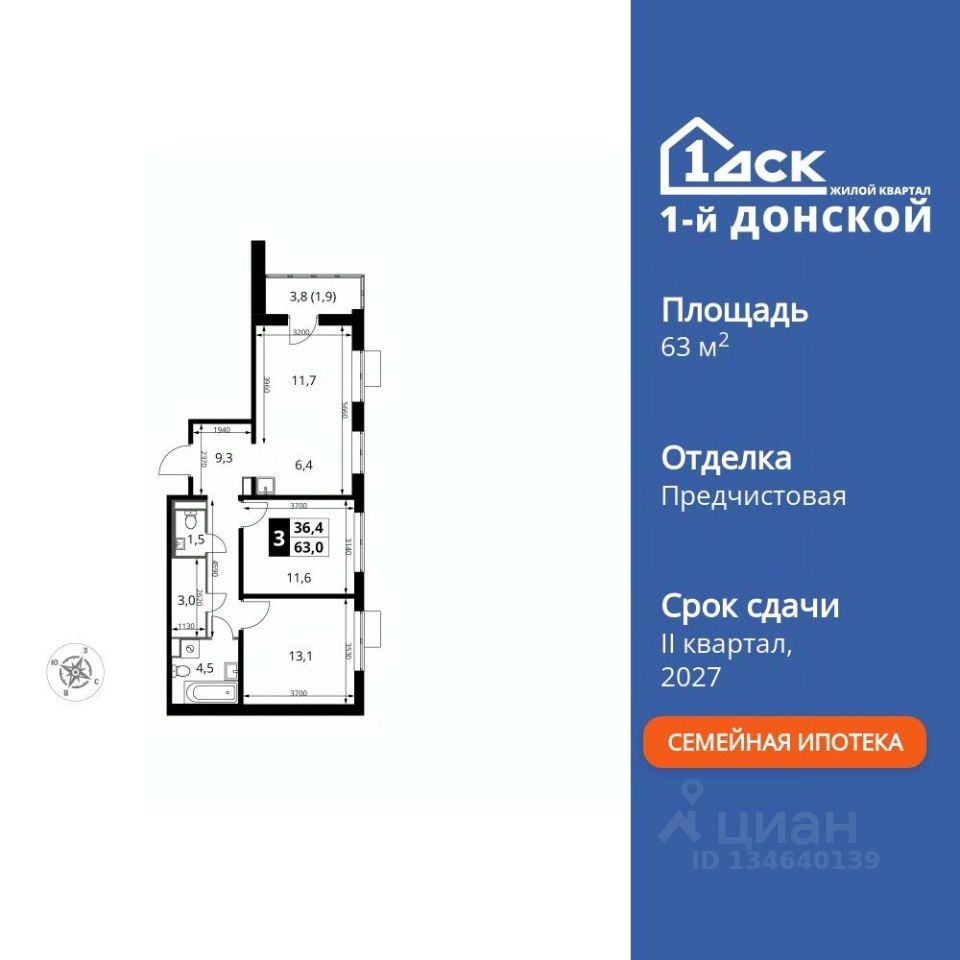 Продаётся 3-к квартира номер 186 общей площадью 63 кв.м. на 18-м этаже 24 этажного здания.