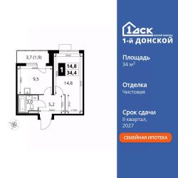 Продаётся 1-к квартира номер 141 общей площадью 34.4 кв.м. на 14-м этаже 24 этажного здания.