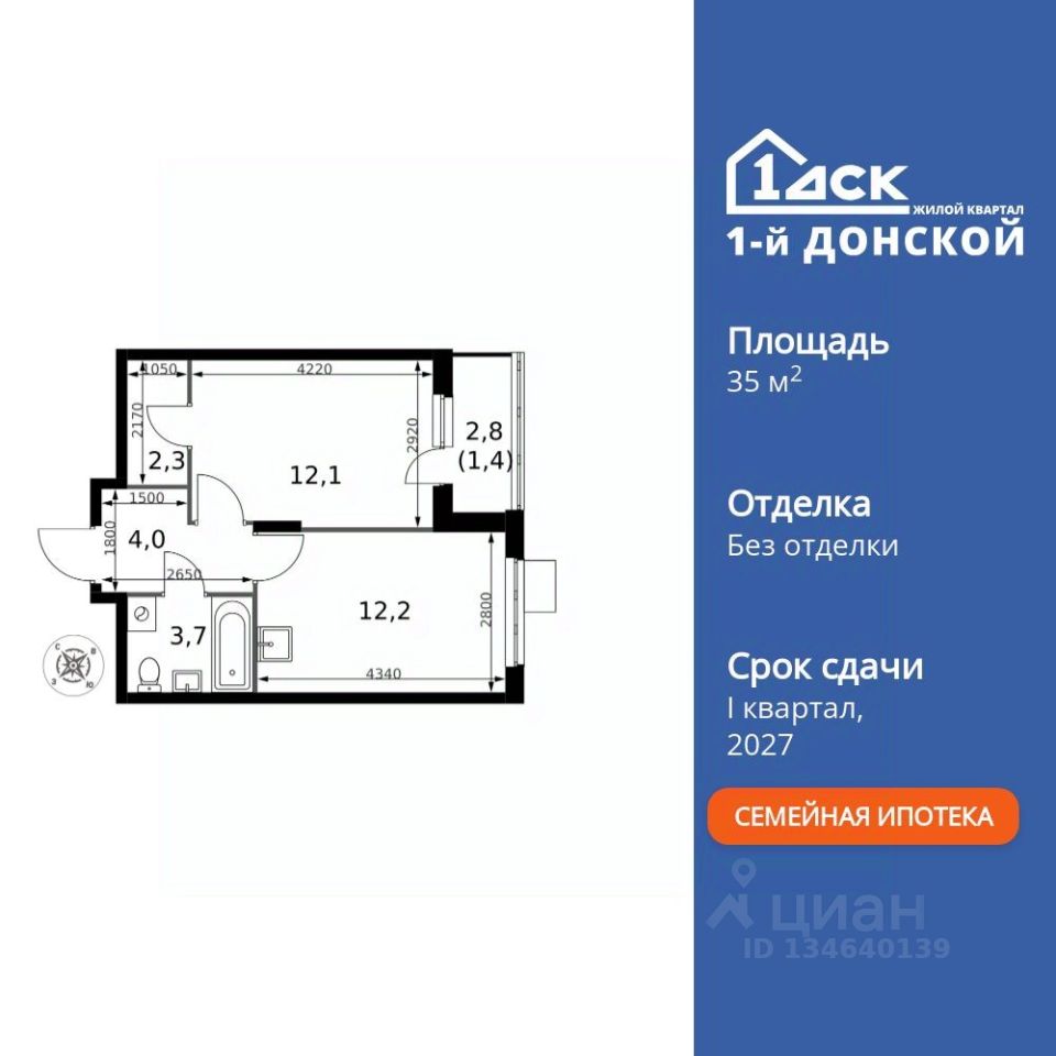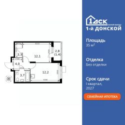 Продаётся 1-к квартира номер 647 общей площадью 35.7 кв.м. на 12-м этаже 24 этажного здания.