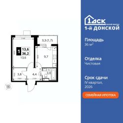 Продаётся 1-к квартира номер 124 общей площадью 36.2 кв.м. на 14-м этаже 24 этажного здания.