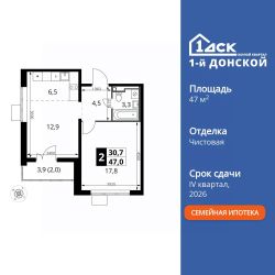 Продаётся 2-к квартира номер 192 общей площадью 47 кв.м. на 21-м этаже 24 этажного здания.
