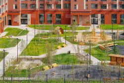 "1-й Донской": продуманная среда в развивающемся районе. На территории - муниципальные школа и 2 детских сада, поликлиника, торговый центр с площадью для мероприятий. Сеть пешеходных маршрутов ведёт к магазинам и кафе, отделённым от дорог зелёными фито-стенами.