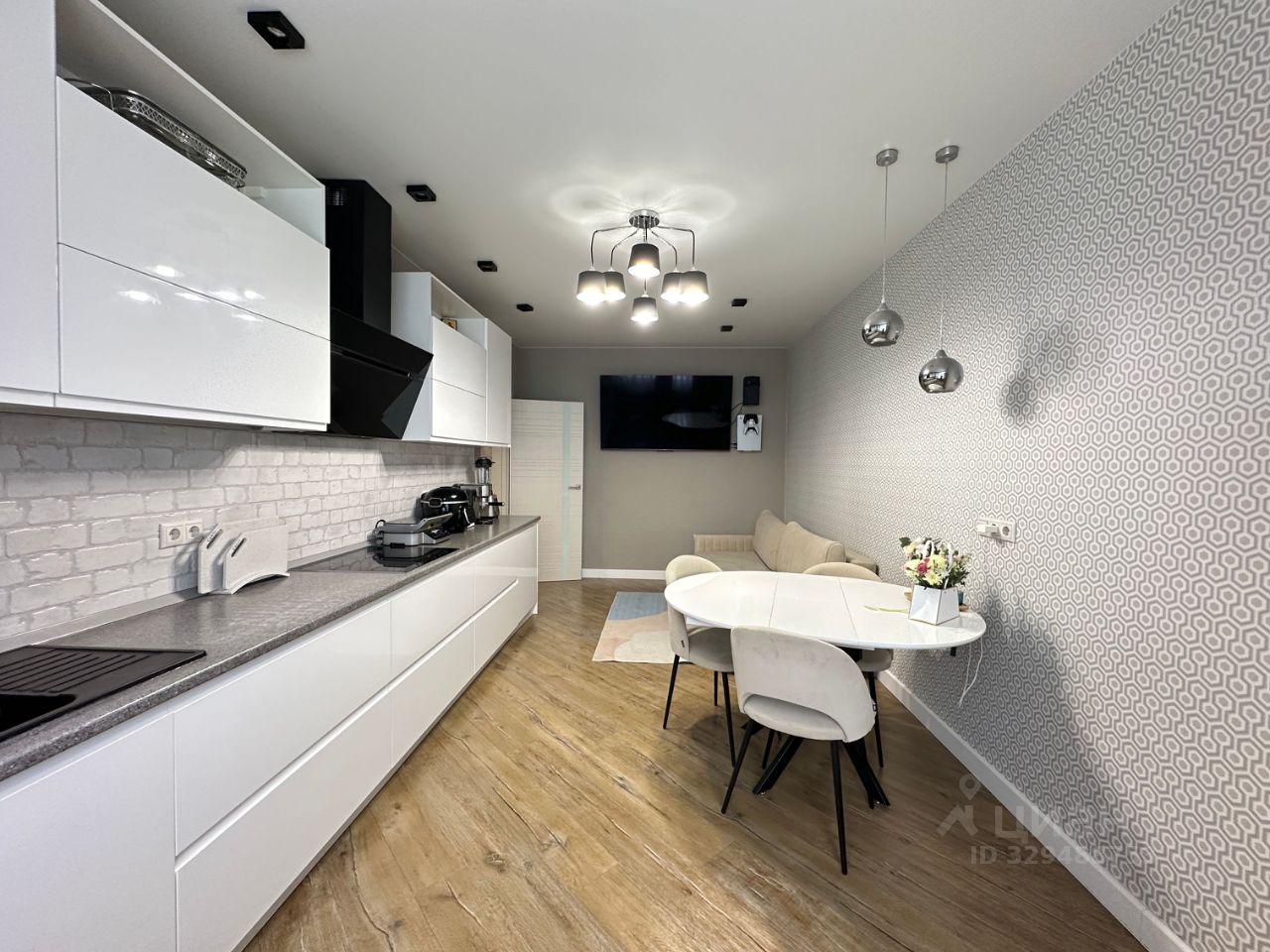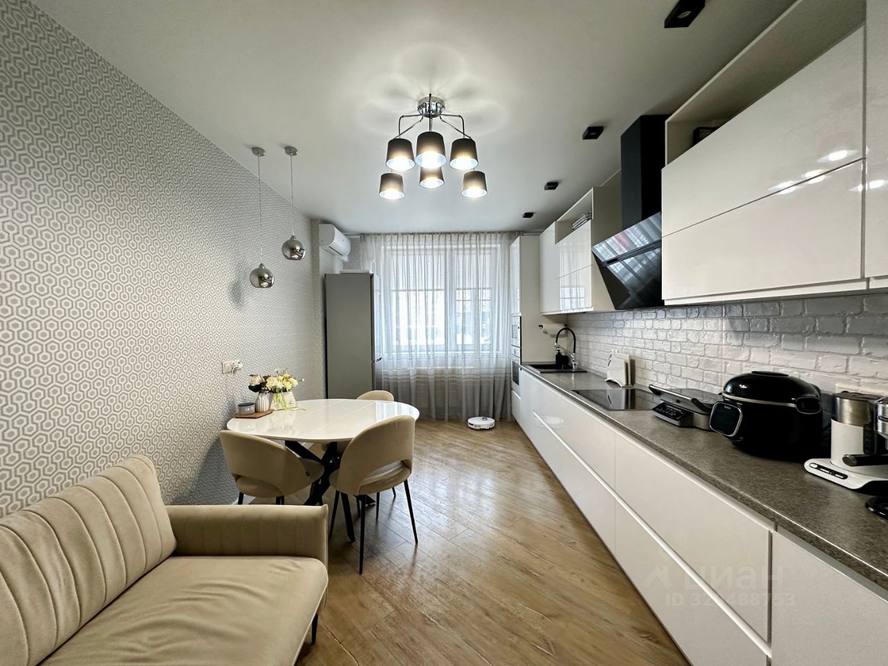 • Кухня-гостиная 19,5 м²: гарнитур изготовлен на заказ, столешница из искусственного камня, встроенная техника Bosch и Siemens, установлен кондиционер.