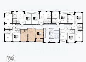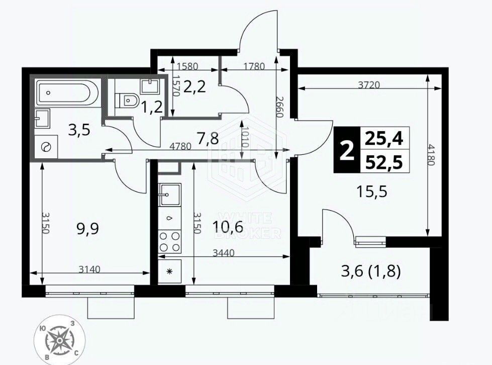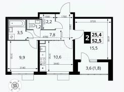 Квартира общей площадью 52.5 кв.м. в предчистовой отделке с жилой площадью 25.4 кв.м. и площадью кухни 10.6 кв.м.
