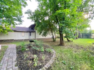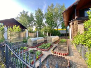 Очень ухоженный и зелёный участок с разнообразными декоративными и плодовыми деревьями: туи, ель, красный и зелёный клены, можжевельник, плодоносят яблоня и вишня, разбиты цветочные клумбы.
