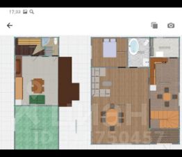 На первом этаже кухня — гостиная 40 кв. Метр, спальня 12 кв. М, кухня 13,8 кв. М., прихожая, коридор, санузел с душевой кабиной, бойлерная, кладовка. Отопление 1-го этажа — теплые полы.