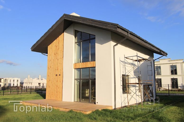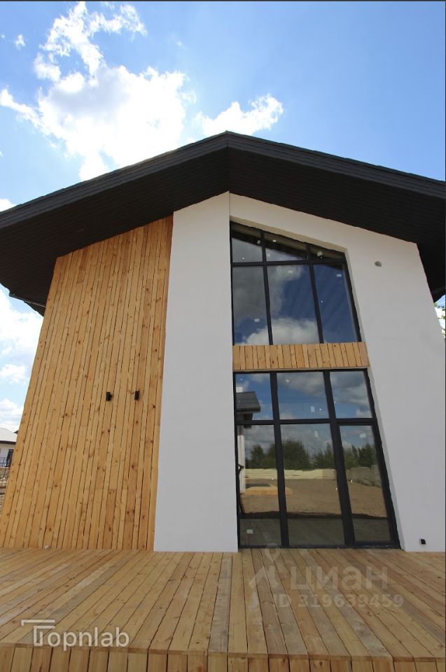 Дом построен из кирпича, снаружи отделан декоративной камешковой штукатуркой, комбинированной с планкеном из хвойных пород древесины, кровля кликфальц, установлены пластиковые окна Rehau, установлено внешнее освещение дома.