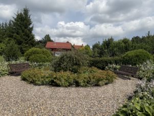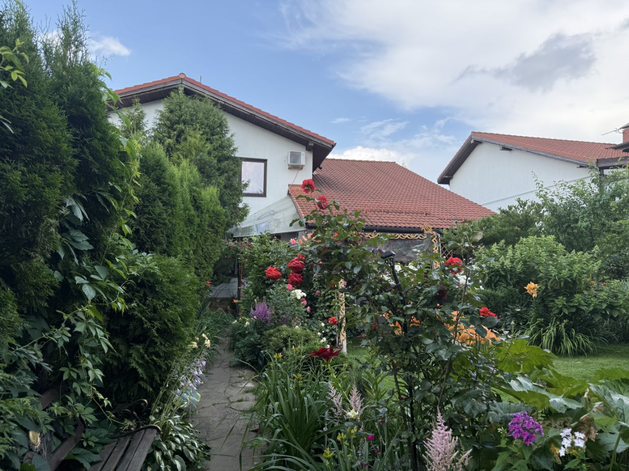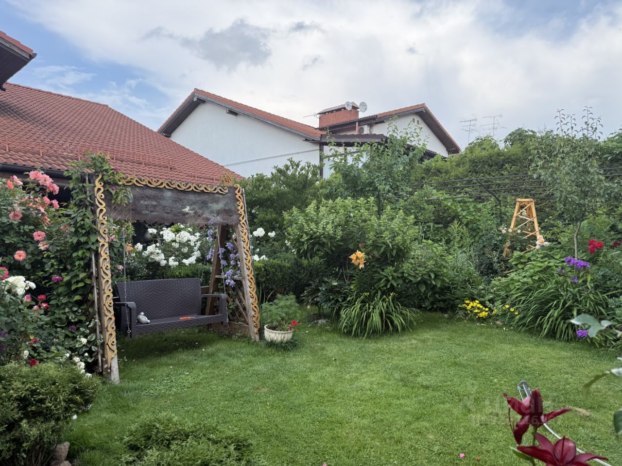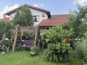 Ухоженный участок с ландшафтным дорогим дизайном: коллекции роз, лилий, клематисов, лилейников. Сад с плодовыми и хвойными деревьями: яблони и черешня, сербские ели, туи, сирень, гортензии. Несколько видов кустарников, можжевельник, жасмин. Место для прогулок и отдыха в тени, небольшой пруд выложен полудрагоценными камнями: яшма и змеевик с каскадом и фонтаном.