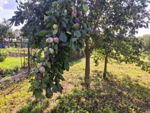 Участок свободный, ровный,с дорожками и плодовыми деревьями и кустарниками: яблоней, сливой, вишней, малиной, смородиной и пр...