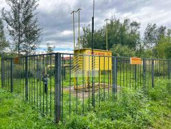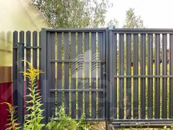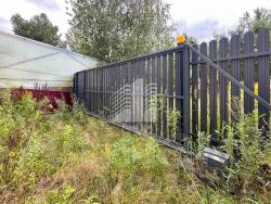 Забор по всему периметру, евроштакетник. Откатные ворота с механизмом на пульте управления.