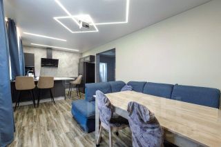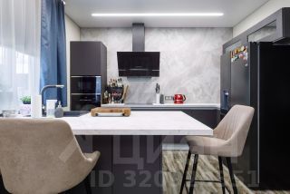 — Уютная кухня-гостиная с большим островом для любителей готовки, в комплекте кухонный гарнитур с бытовой техникой немецкого производителя.