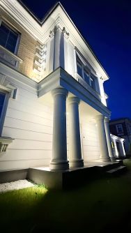 Выполнен многослойный дренаж почвы, система автоматического полива, робот газонокосилка, ландшафтное освещение, подсветка фасадов дома.