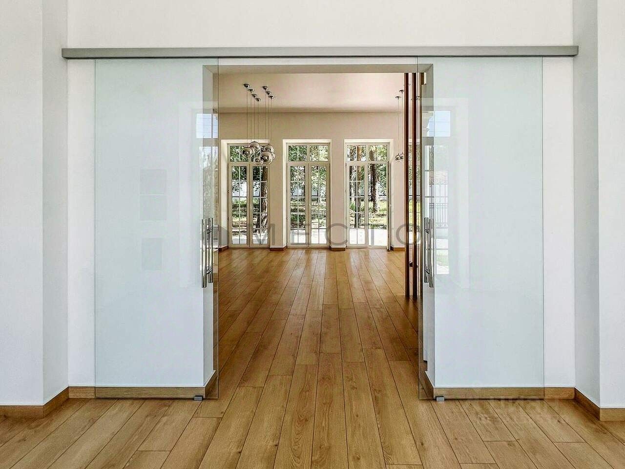 Благодаря многочисленным панорамным окнам по фасаду, высоте потолков до 3,7 метров, дом очень светлый, а с эксплуатируемой кровли открывается вид на лес и крупномерные сосны и ели.