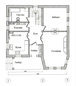 * 1-й этаж: Просторная кухня, гостиная, кабинет, санузел и кладовая.