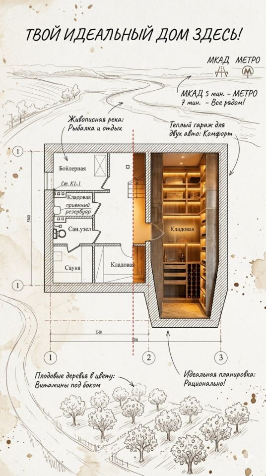 * Цокольный этаж: Пространство с санузлом, бойлерной и кладовыми — идеальное место для спортзала, бильярдной или домашнего кинотеатра.