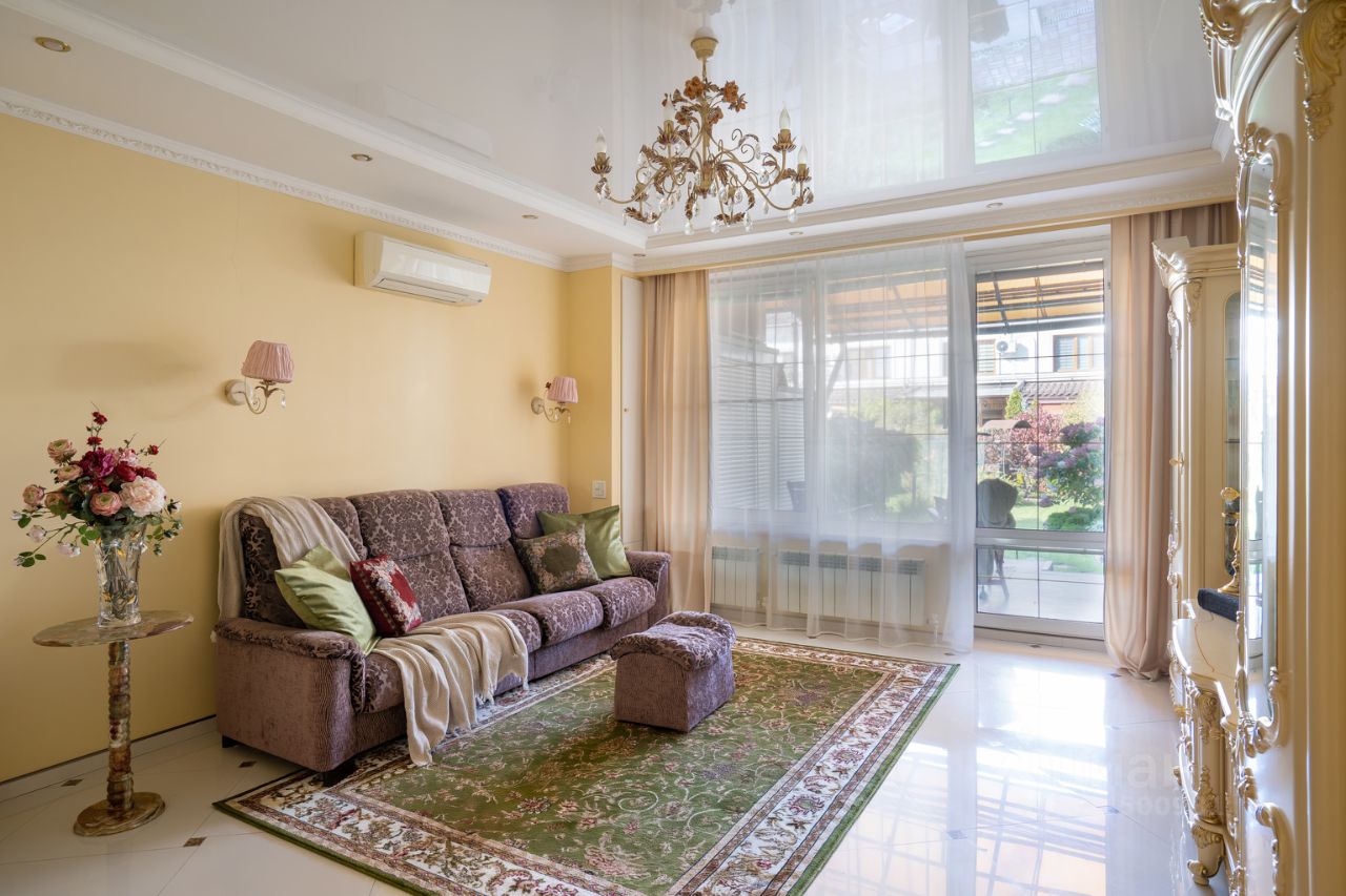 - просторная гостиная с выходом на веранду и на участок (4,8х22 м) с газоном, кустарниками, цветами и зоной барбекю