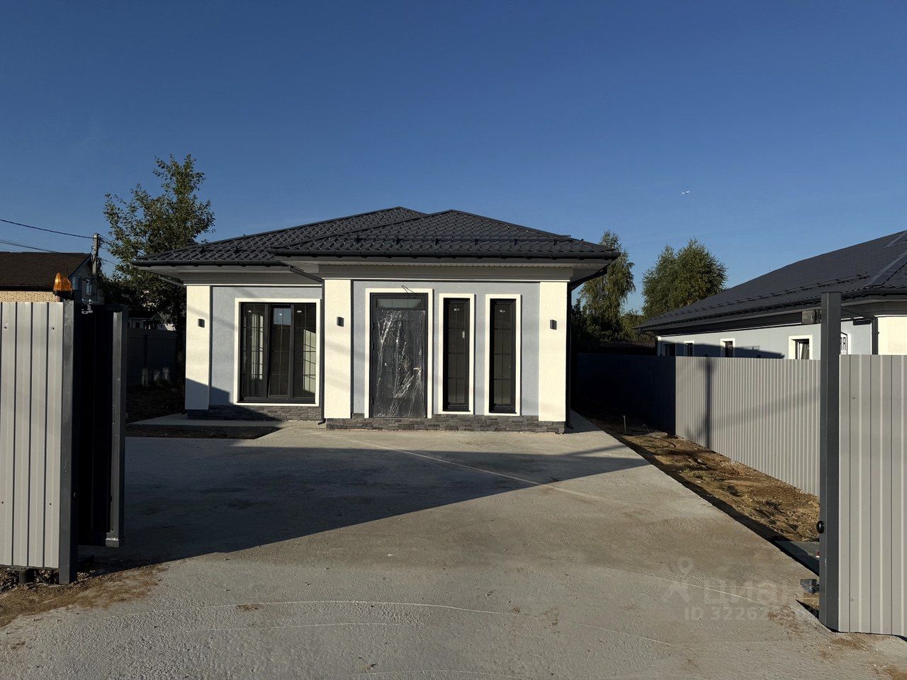 Автоматические ворота, залитая площадка под авто, выровненная территория, фасад с автоматической подсветкой, выполнен из немецкой штукатурки Ceresit (Henkel) с соблюдением технологии.