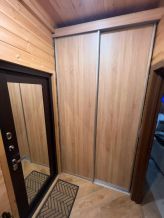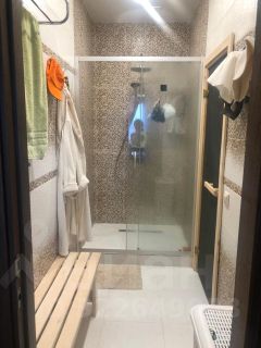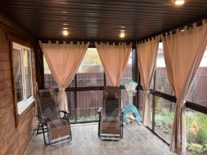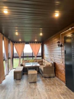 1 этаж. Большая терраса 24м2, на которой плетеная мебель из эко-ротанга, 2 кресла-шезлонга. Прихожая с встроенным шкафом-купе, топочная-бойлерная, кухня-гостиная оборудованная встроенной газовой, варочной панелью, электродуховой шкаф. Встроенный шкаф-купе в гостиной. Сауна из комбинированного дерева, туалет и душевая в плитке.