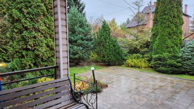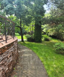 Ухоженная территория, живописные прогулочные дорожки из натурального камня, ландшафтный дизайн, декоративные деревья и кустарники, площадка под бассейн, и отдельная площадка под зону барбекю, наружное освещение, газон. Охрана.