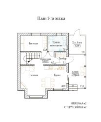 1 этаж - просторная совмещенная кухня-гостиная с портальным выходом на террасу, гостевая комната, санузел, техпомещение.