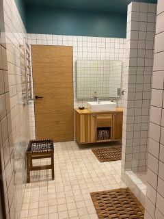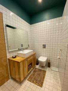 В санузле — тёплый пол, стиральная машина, стильная ванная зона, создающая атмосферу уюта.