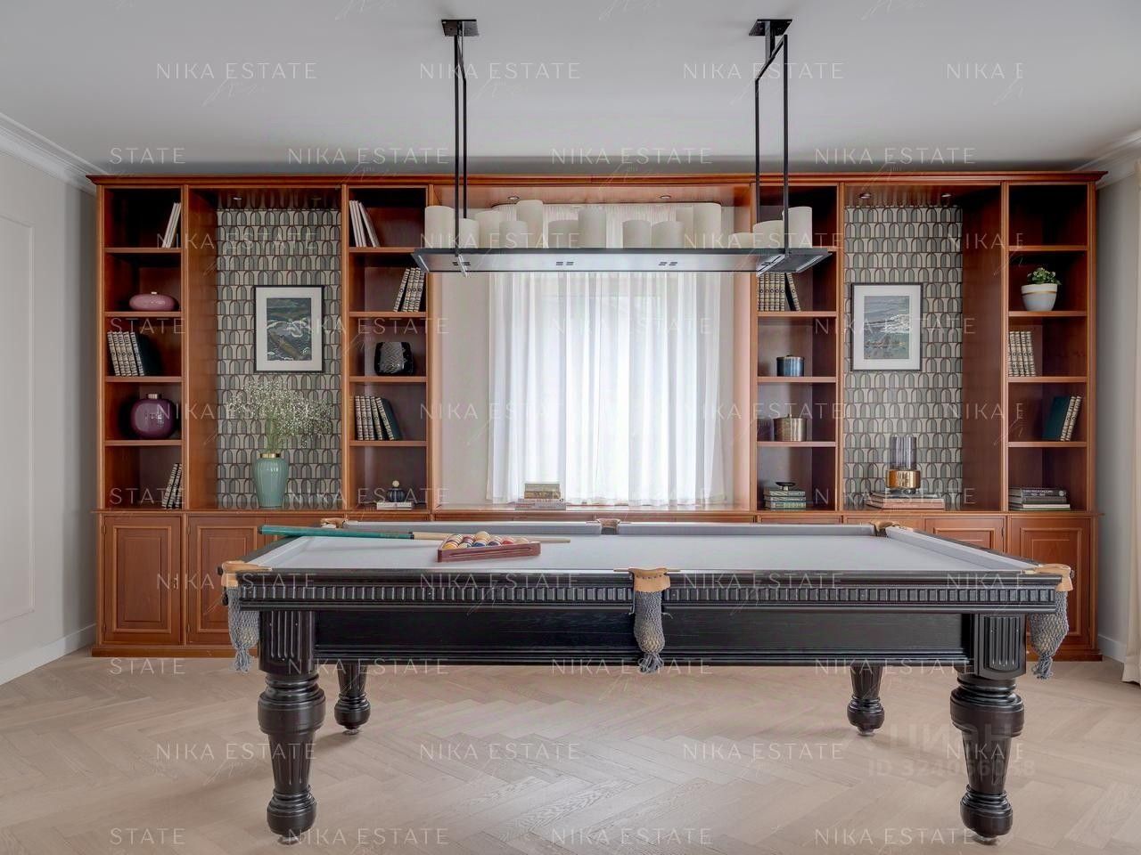 * Первый этаж: большая гостиная с камином и бильярдом, кухня-гостиная с выходом на участок, санузел и прихожая.