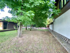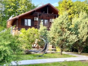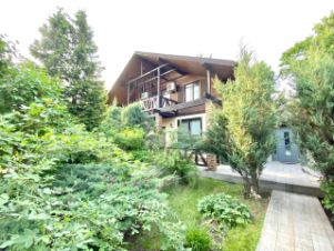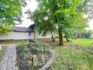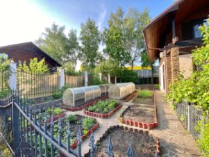 Очень ухоженный и зелёный участок с разнообразными декоративными и плодовыми деревьями: туи, ель, красный и зелёный клены, можжевельник, плодоносят яблоня и вишня, виноград. Разбиты цветочные клумбы.