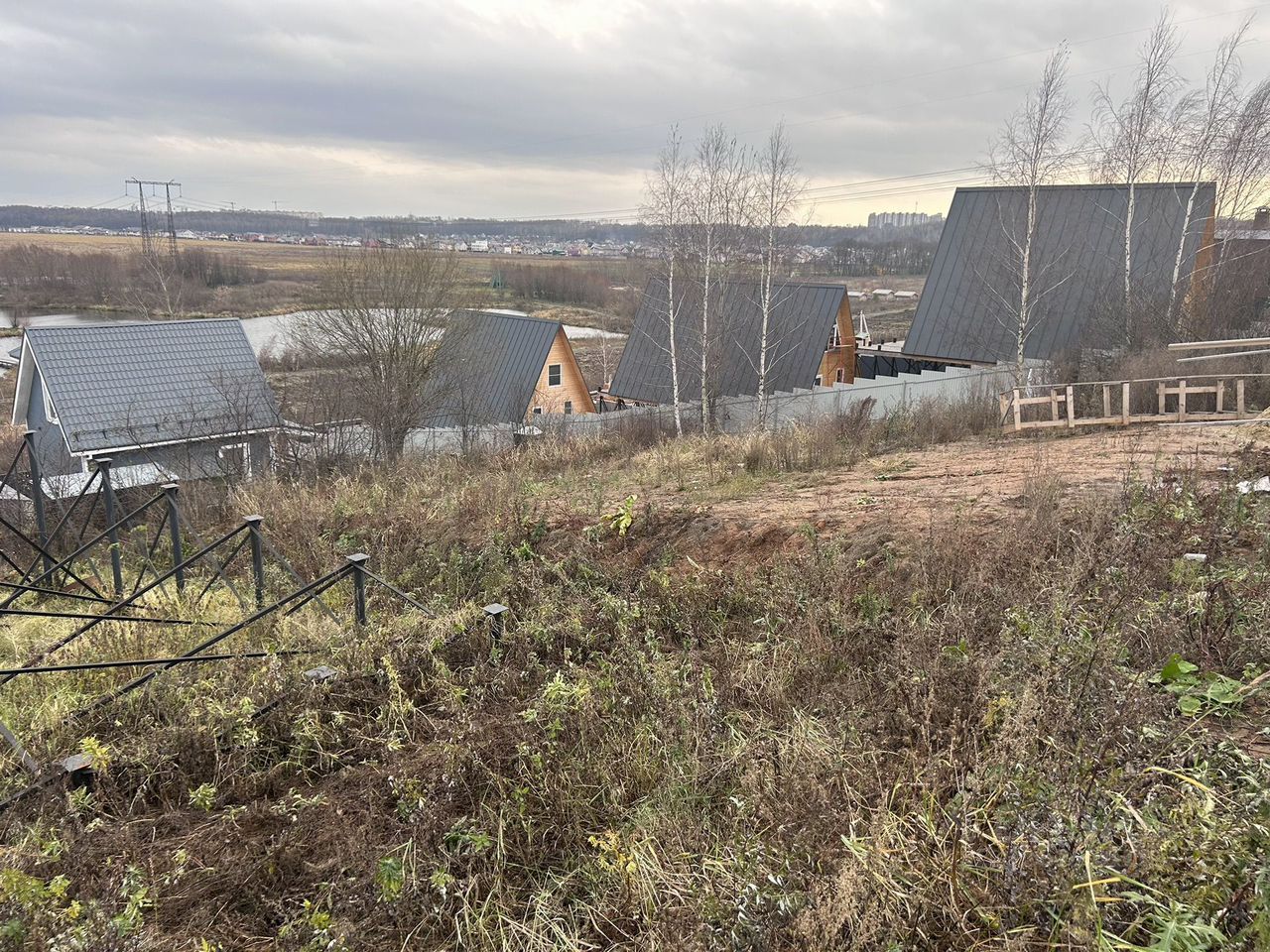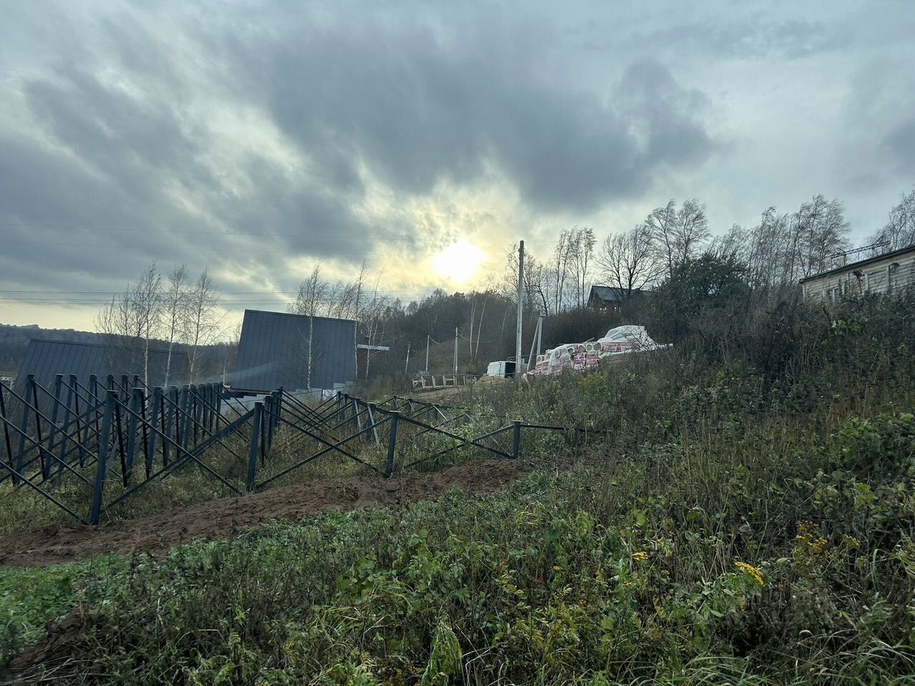 Построек нет, Участок снт Мосмек 5. Номер на фото. Участок на находится прямо за синим домиком на предпоследнем фото. Прямо напротив рыболовной усадьбы остров, рядом с горнолыжным спуском и пляжем. Второй ряд. От дороги со склона третий участок. Очень удобный подъезд.