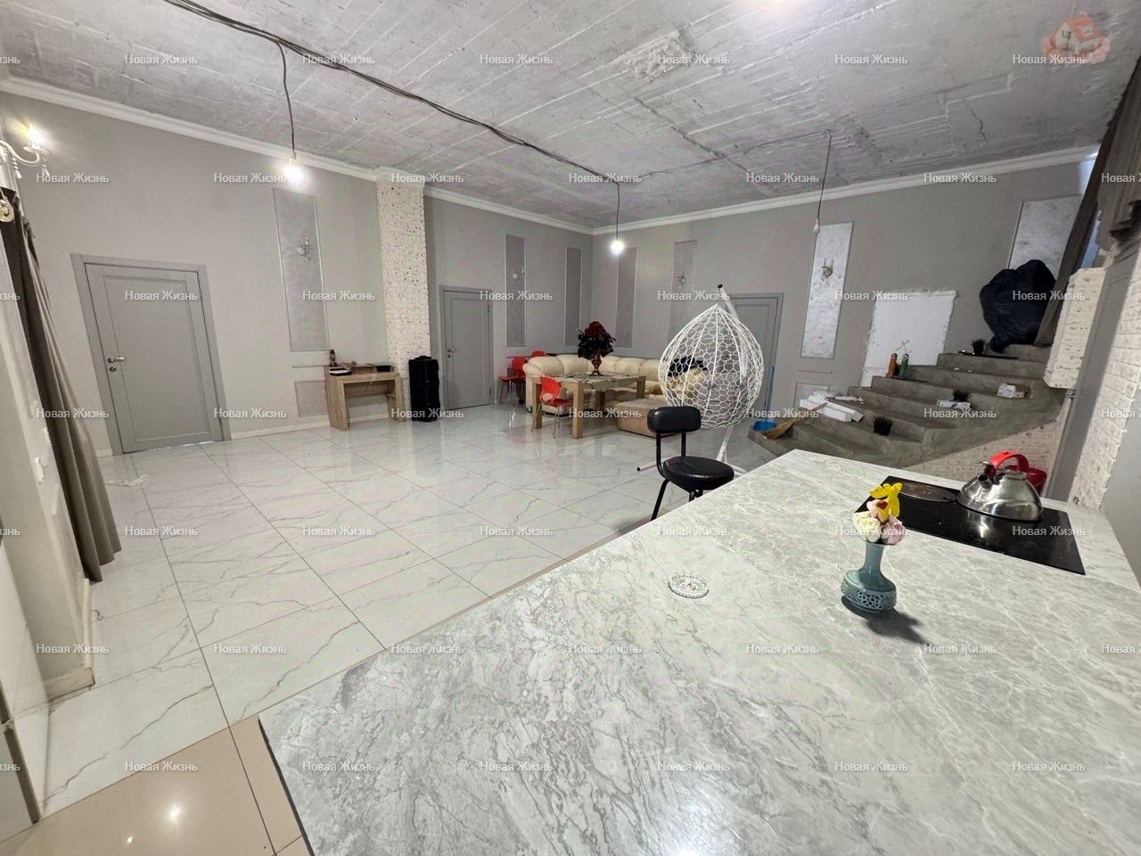 Первый этаж: Кухня-гостиная. В другой части дома расположена отдельная кухня с комнатой для гостей, с отдельным выходом.