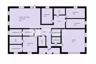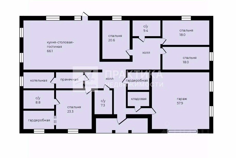 прихожая, холл, сан. узел 7,3 кв.м., кухня-столовая- гостиная 66,1 кв.м., мастер спальня 23,3 кв.м. с с/у 8,8 кв.м. и гардеробом, холл, три спальни (20,6 кв. м., 18 кв.м. 18 кв.м.), с/у 9,4 кв.м., гардеробная, прачечная, котельная, кладовая, гараж 57,9 кв.м.