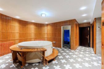 В цокольном этаже территория отдыха с сауной, хамам, напольным небольшим бассейном с гидромассажем, душевые, санузел, комната отдыха с телевизором, диваном, массажным креслом и аэрохоккеем, кухня с газовой плитой, комната для домработницы, санузел, кладовая со стеллажами, постирочная, техническое помещение, гараж.