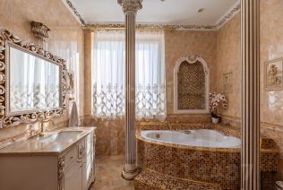 В доме установлены теплые полы и керамогранитное покрытие, а кованая лестница ведет на все этажи.