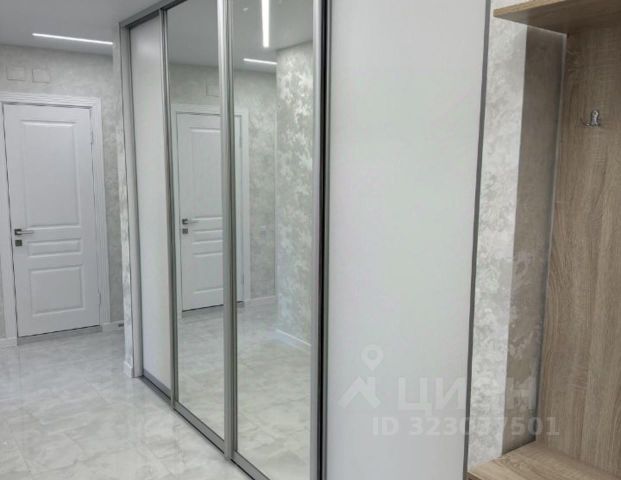 В прихожей большой шкаф-купе, ящики при входе и галошница, тёплый пол
