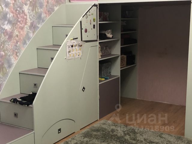 В детской рабочий стол, кровать-чердак 120х180 с выдвижными ящиками в лестнице, шкаф для одежды, ковёр, окна во двор, восточная сторона