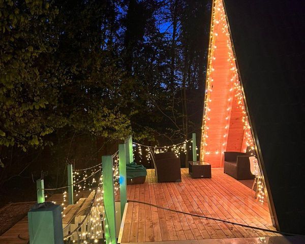На первом этаже гостиная с кухней, санузел и маленькая баня. В гостиной располагается раскладной стол, раскладной диван, телевизор - смарт, музыкальный центр, кондиционер, дровяной камин, беспроводной интернет. Кухня наполнена всем необходимым, посуда для приготовления и сервировки, холодильник, варочная плита с духовкой, микроволновая печь, бутыль 20л с питьевой водой. На втором этаже размещаться изолированная спальня с двумя двуспальными кроватями, атак же двуспальная кровать в открытой лаундж-зоне.