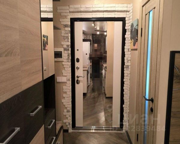 В прихожей большой шкаф-купе, ящики при входе и галошница, тёплый пол