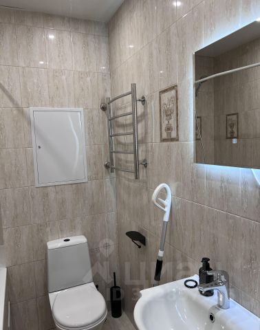 В большом санузле унитаз, гигиенический душ, душевая кабина (тропический душ), 2 выдвижных ящика под раковиной, подвесные ящики, тёплый пол