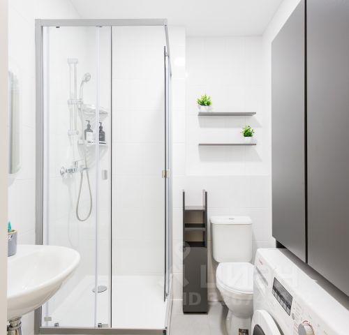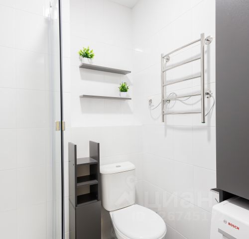 В ванной комнате: подвесной шкаф, на нём раковина, зеркало с подсветкой, сама ванна, туалет, стиральная машина, электрический полотенцесушитель