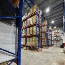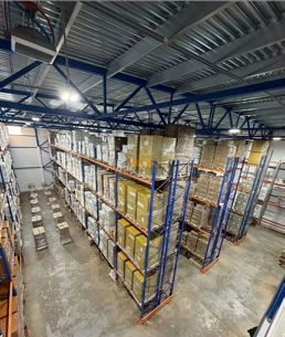 Склад оборудован стеллажами.